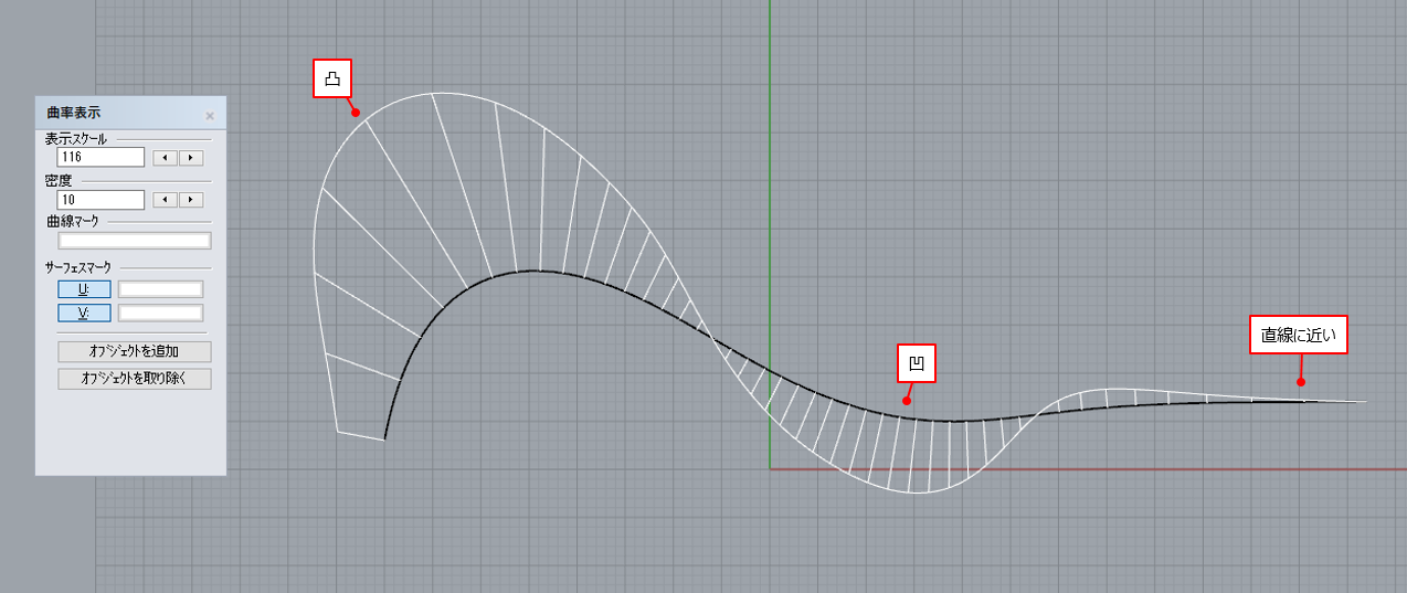 うねうねした自由曲線の曲率を表示してみると、櫛のようなものが表示されます。