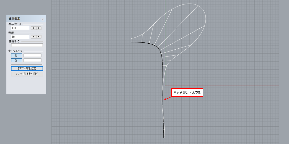曲率を表示してみると、一部だけ左側に凹んでいることがわかります。